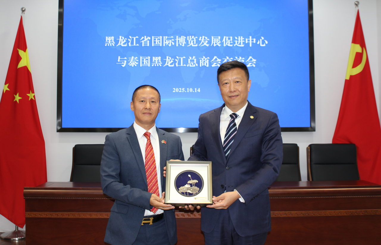 10月14日上午,黑龙江省贸促会副会长、省国际博览发展促进中心主任谭百成会见泰国黑龙江总商会会长刘作超一行。