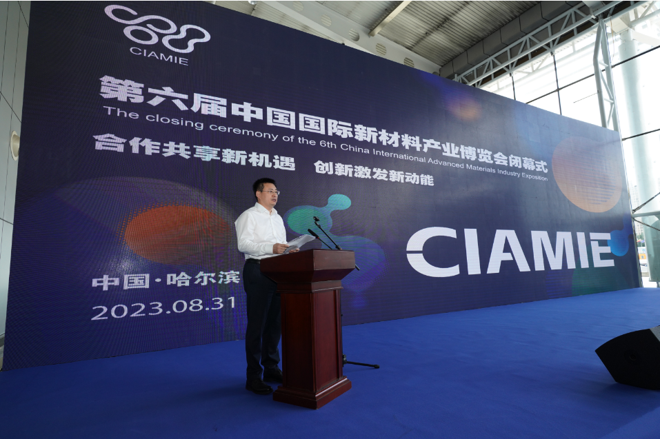 由工业和信息化部、黑龙江省人民政府共同举办的第六届中国国际新材料产业博览会于2023年8月29-31日在哈尔滨成功举行。8月31日下午,在哈尔滨市国际会展体育中心展厅路演区,举行了本届新博会的闭幕式。省工信厅、省贸促会、省科技厅、工信部国合中心等相关负责人,受表彰单位、大赛获奖单位、新闻媒体代表等出席参加本次闭幕式。