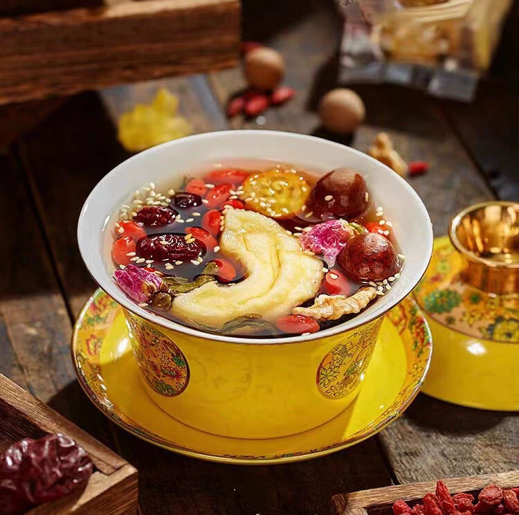 八宝茶是流传于民间的传统饮品,一般配有红枣、玫瑰酱、葡萄干、桂圆干、枸杞、芝麻、冰糖、苹果干、核桃、山楂片、白糖、绿茶等材料,可以根据自己的喜好增加或减少,既可以选十几种,也可以挑三五种。