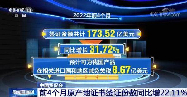 中国贸促会:今年前4个月原产地证书签证份数同比增长22.11%
