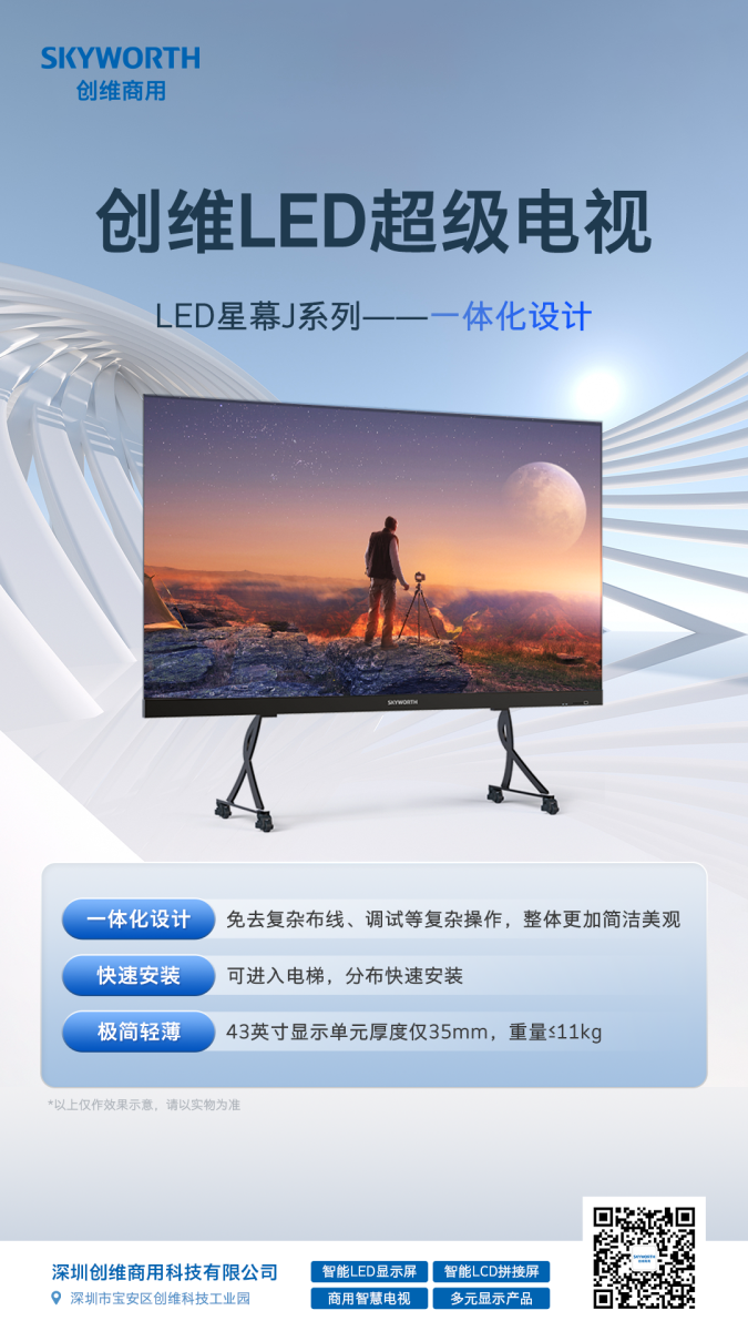 深圳创维商用科技有限公司为深圳创维RGB 电子有限公司全资子公司,主营业务涉及智能 LCD 拼接屏、智能 LED 显示屏.商用智慧巨幕、智慧商用电视、激光电视、AirHub 办公电视、智慧屏等。创维商用不拘泥于现有格局,倾力打造下一代商用智慧解决方案的系列产品,将为我们的商业伙伴在全场景、多角度的商业旅程中保驾护航。“